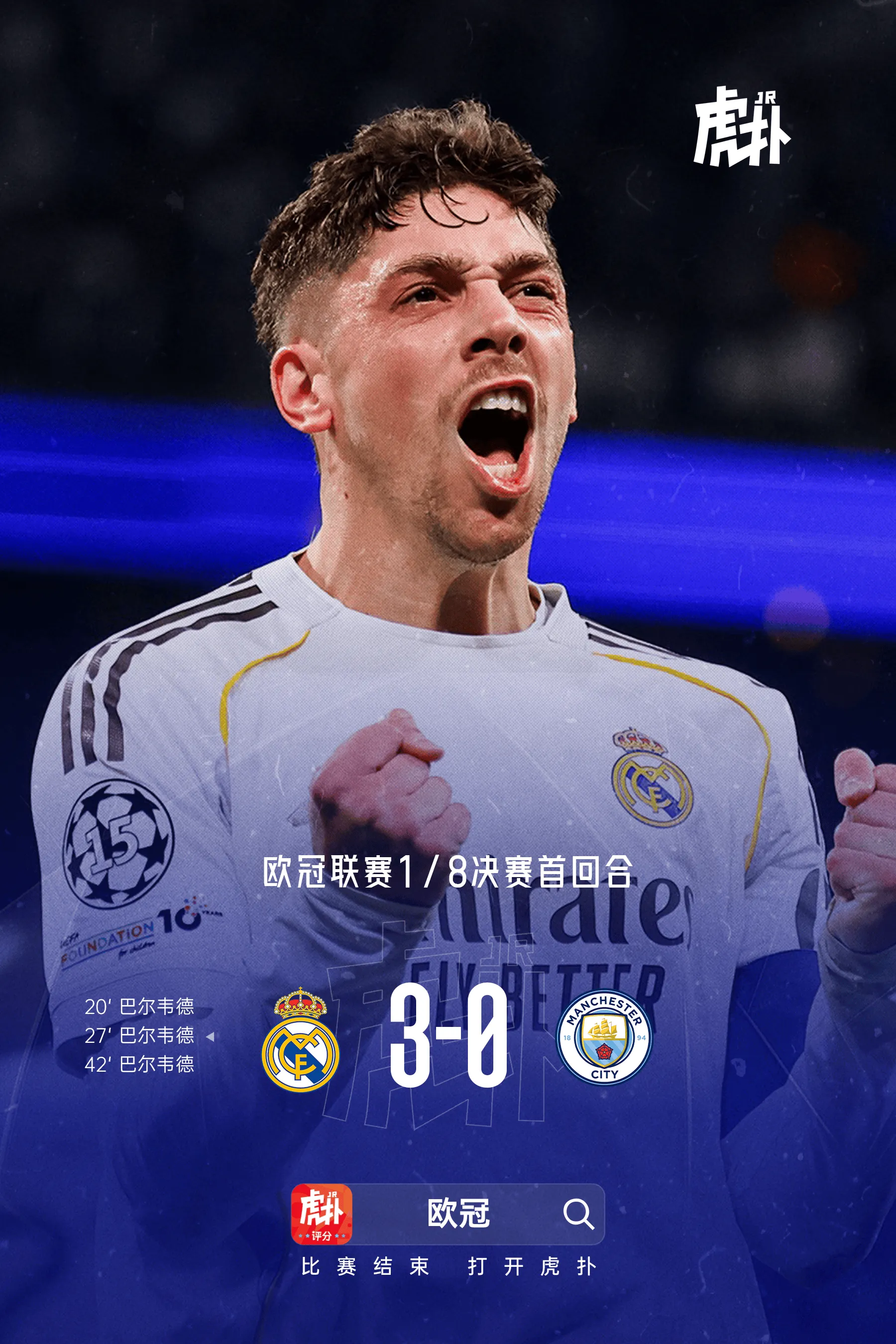本场比赛上半场,皇马凭借队长巴尔韦德的帽子戏法3-0领先曼城。在球队遭遇多名伤病、包括头号射手姆巴佩缺阵的情况下,乌拉圭中场挺身而出,用三个精彩进球帮助皇马在半场建立优势。